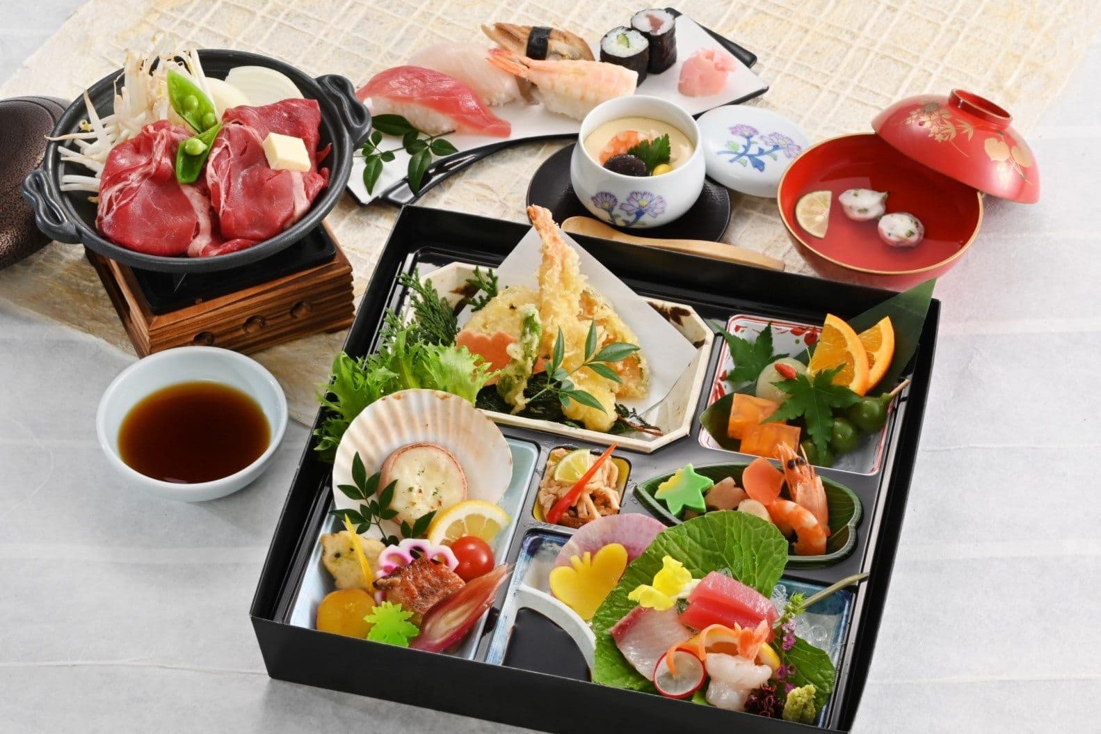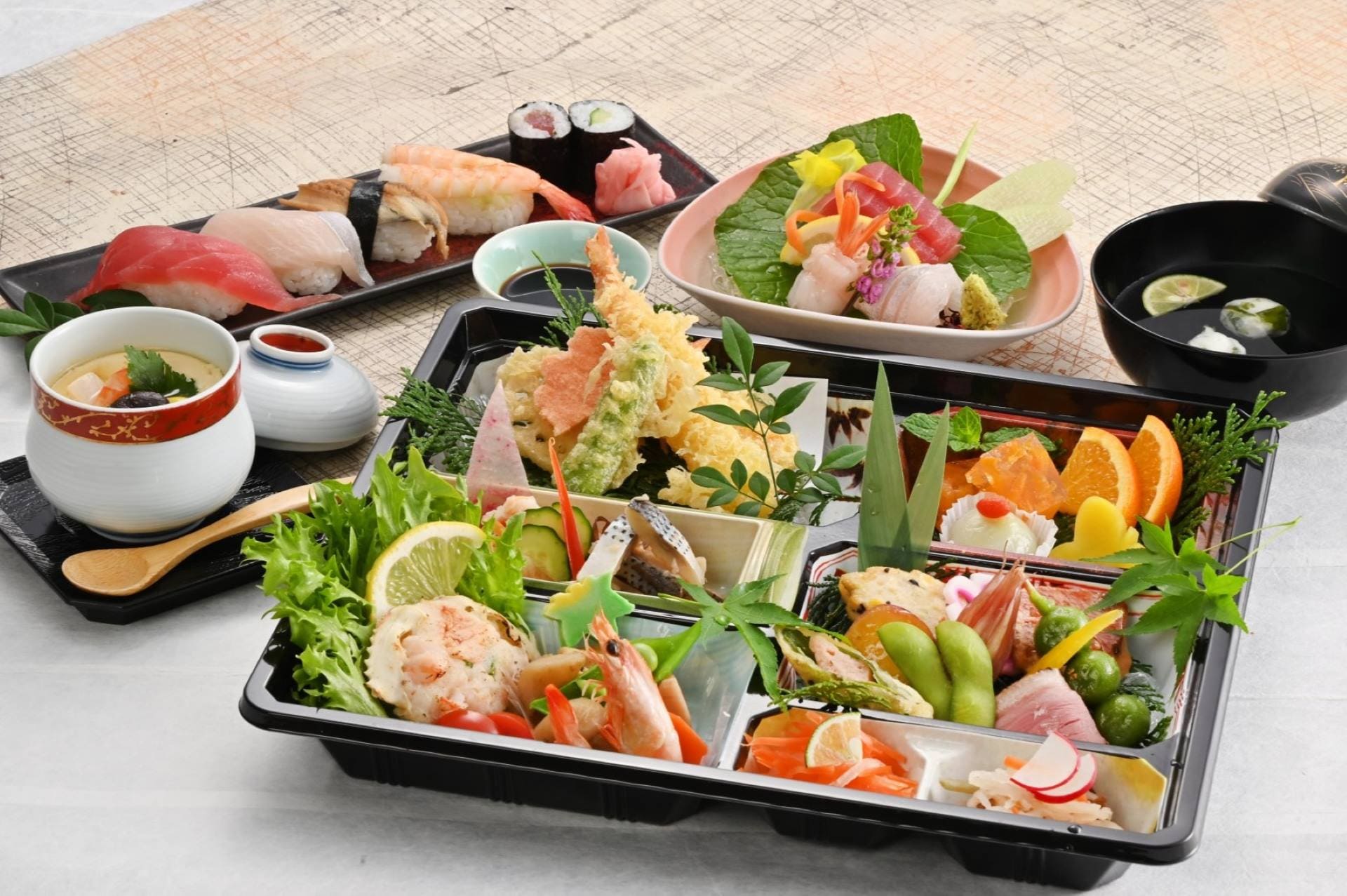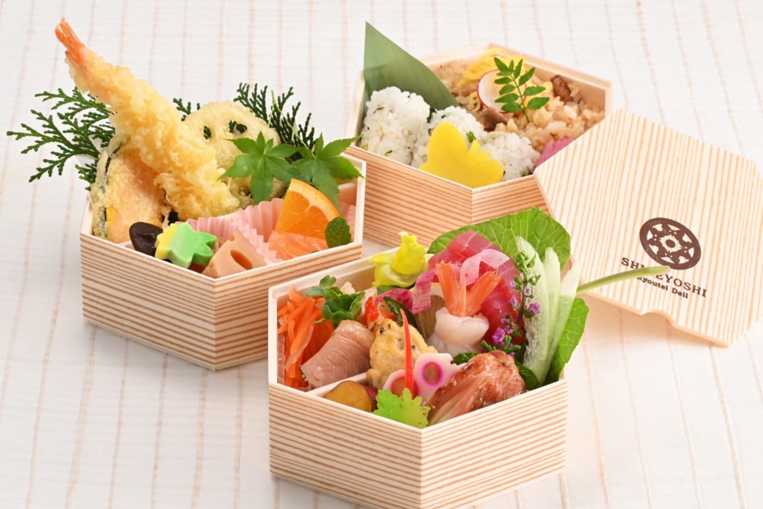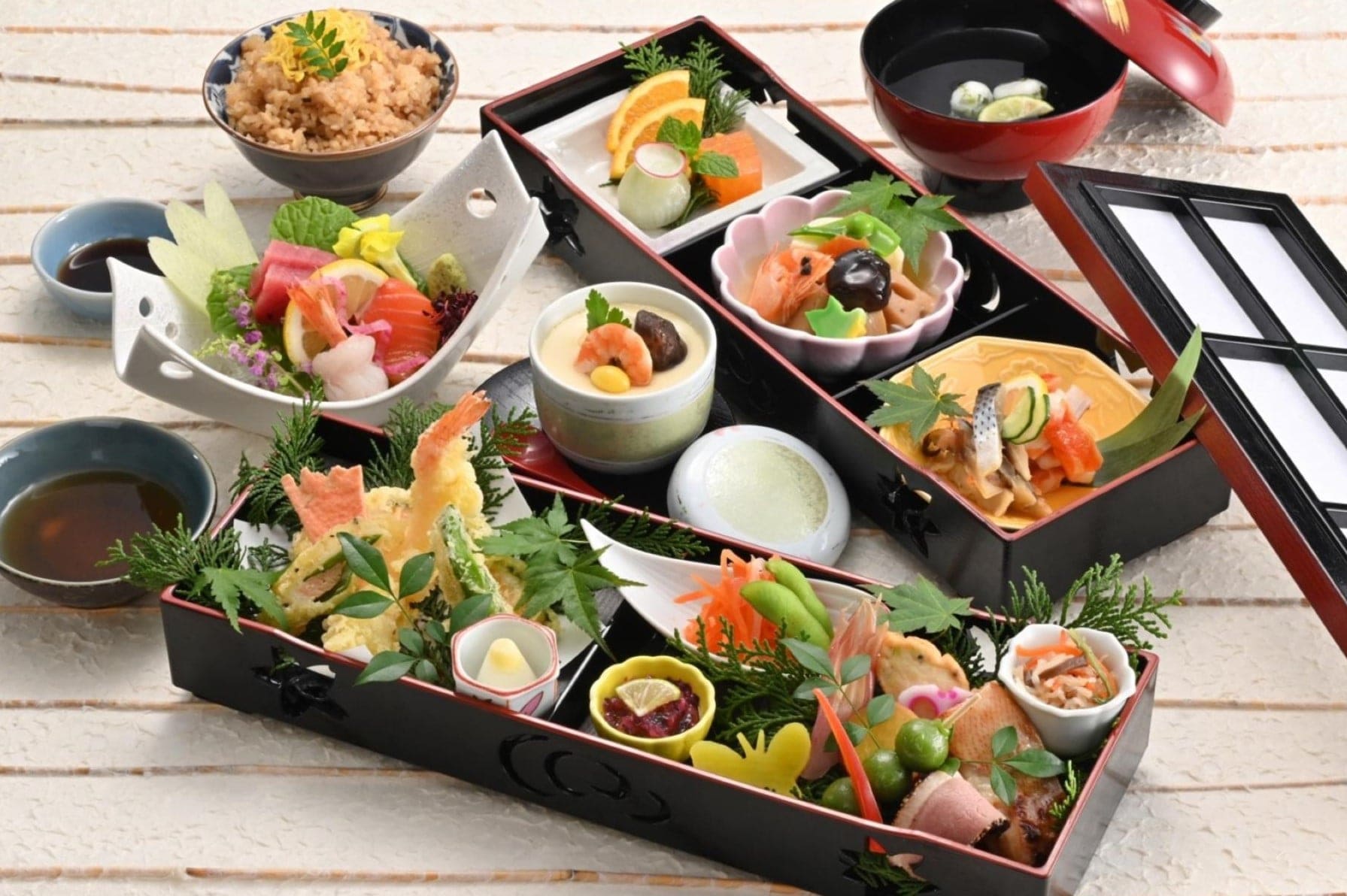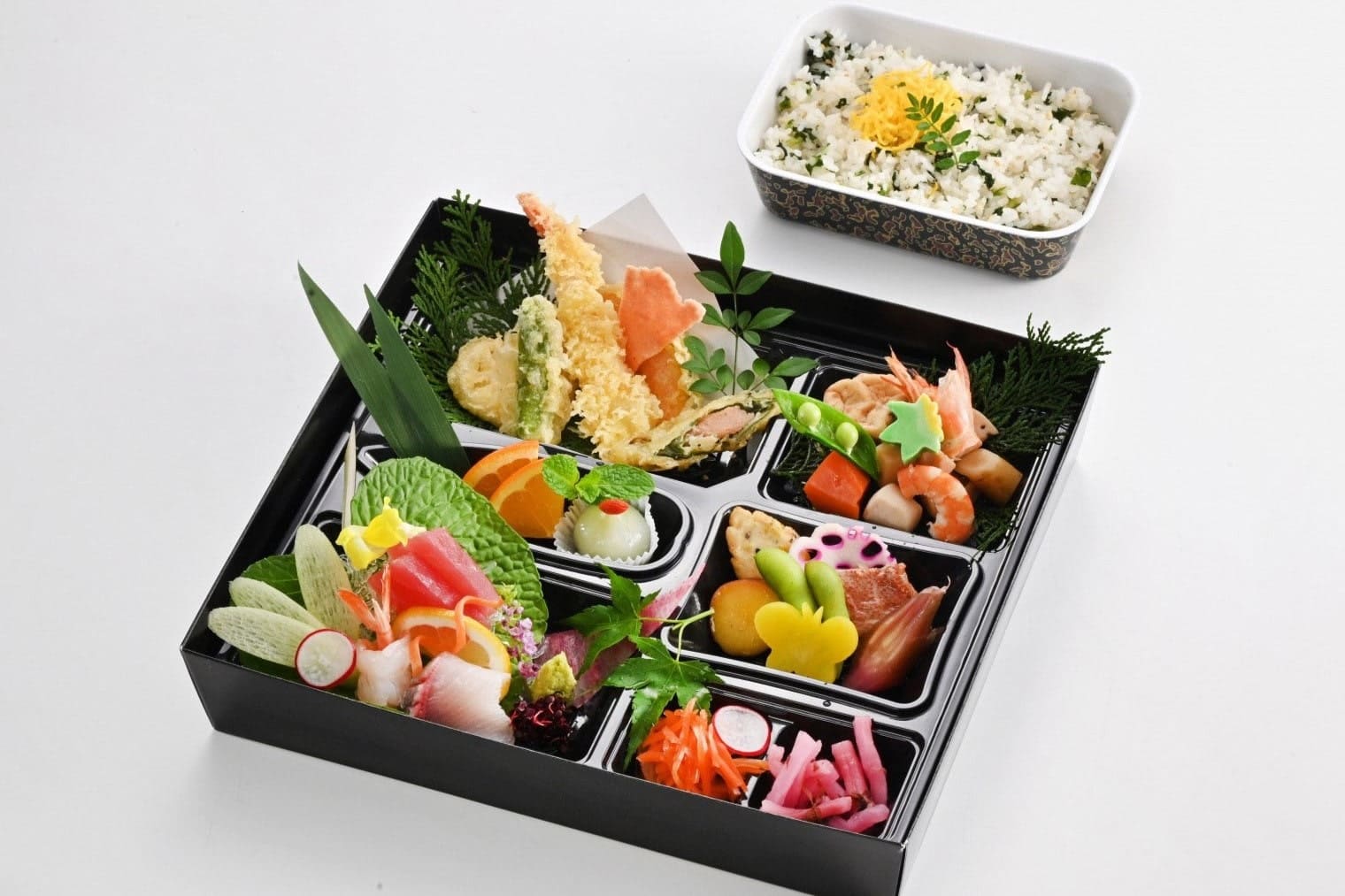 八寸、和え物、焚き合せ、天麩羅、酢の物、御飯、フルーツなどを12マスのお弁当箱に。華やかさと最後まで飽きさせない料亭の味わいをお楽しみいただけます。