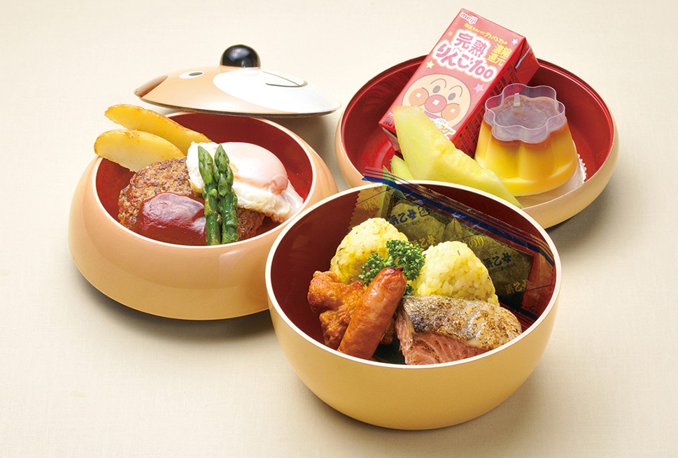食べやすいサイズのおむすび、目玉焼き付きハンバーグやウィンナー等お子様に人気のおかずにお菓子、おもちゃ付き。可愛らしい使い捨ての容器でお届けします。