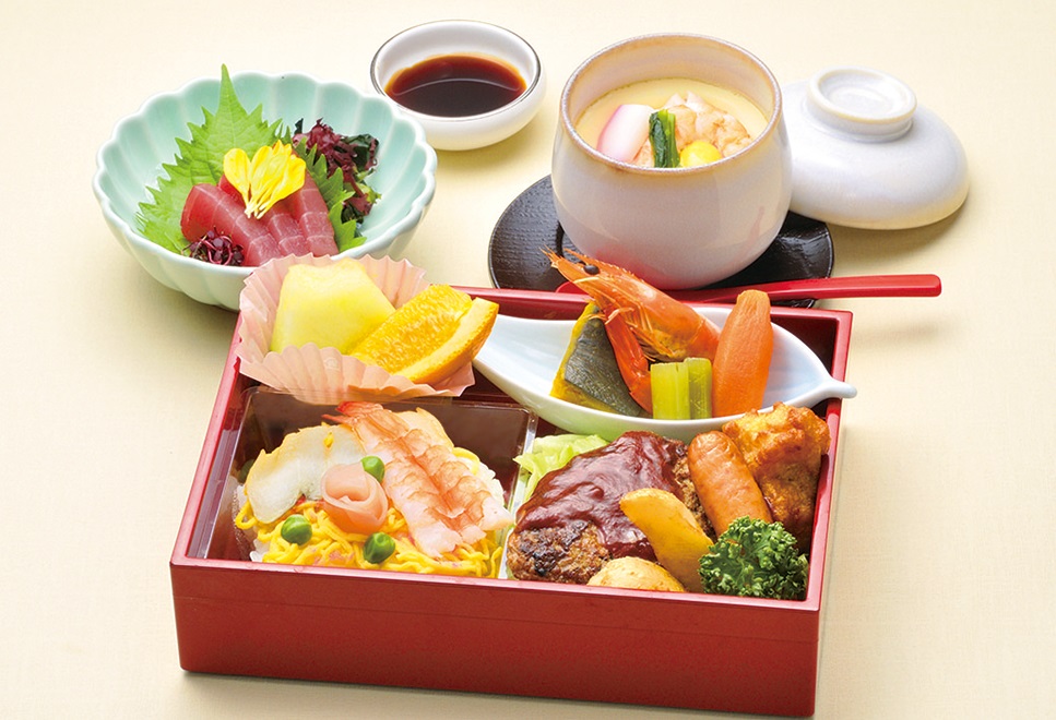 ハンバーグやウィンナー等お子様に人気のおかずに、ちらし寿司やお造り、茶わん蒸しが付いた、ちょっと贅沢な会席です。