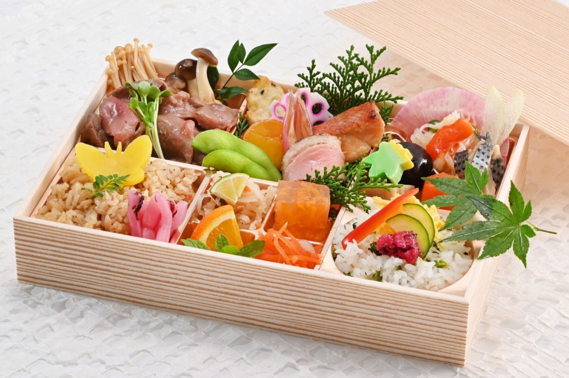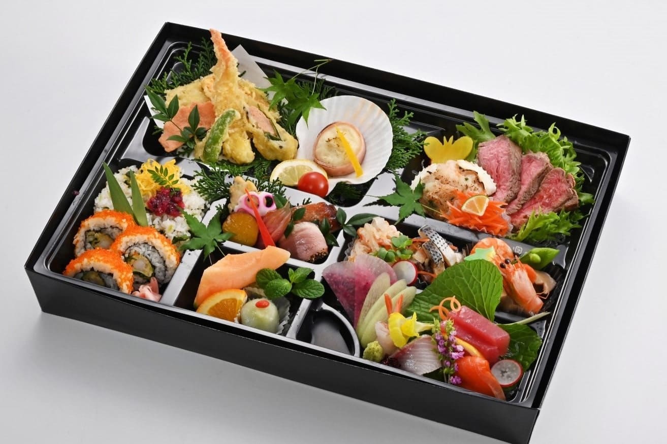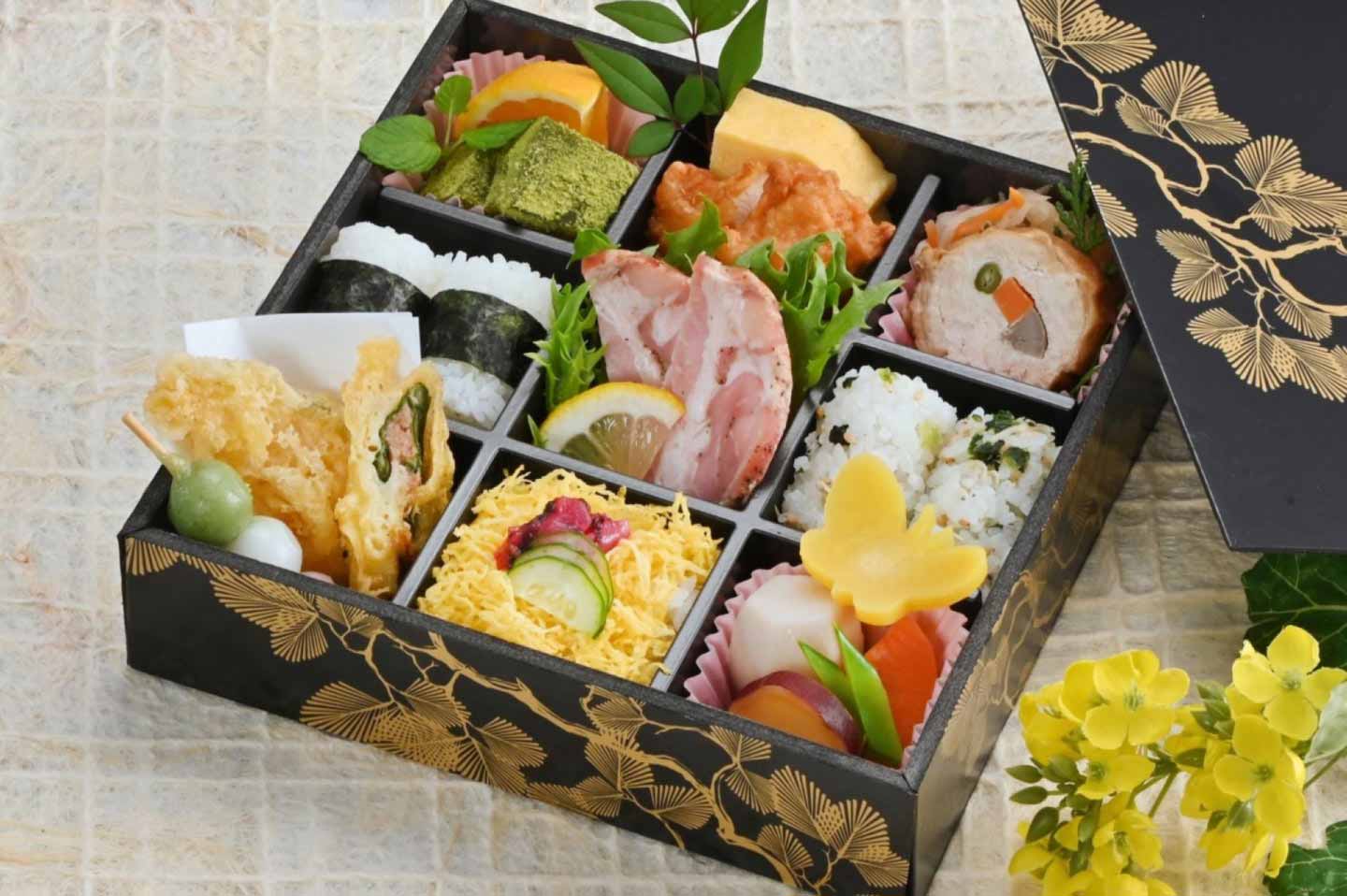 八寸、洋食盛、焚き合わせ、揚物、御飯、フルーツを9マスのお弁当箱に。華やかな彩りと深い味わいが織りなす一品です。